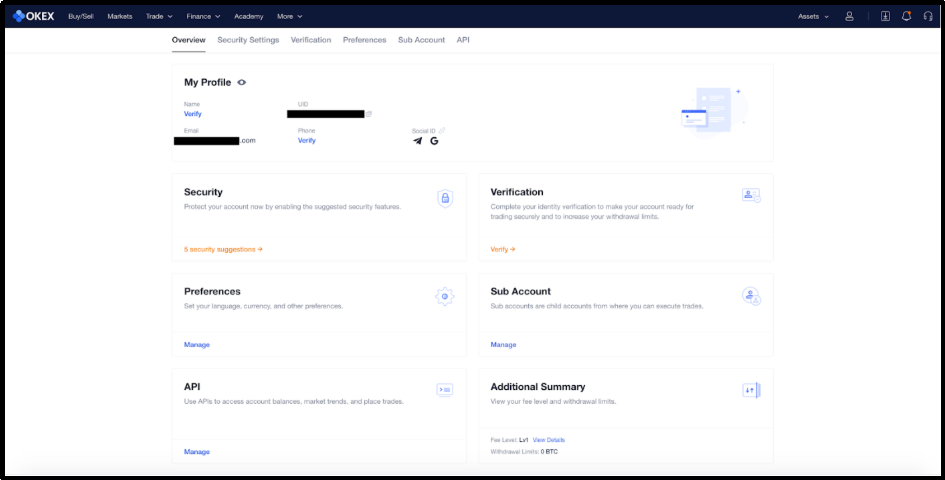 The Overview section displays your profile information as well as other account settings, such as Security, Verification, Preferences, Fee Level, Withdrawal Limits, etc.