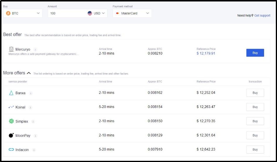 In this page you will see multiple service providers (Mercuryo, Banxa, Koinal, Simplex, MoonPay, Indacoin etc). The best offer at that point of time will appear at the top of the page.