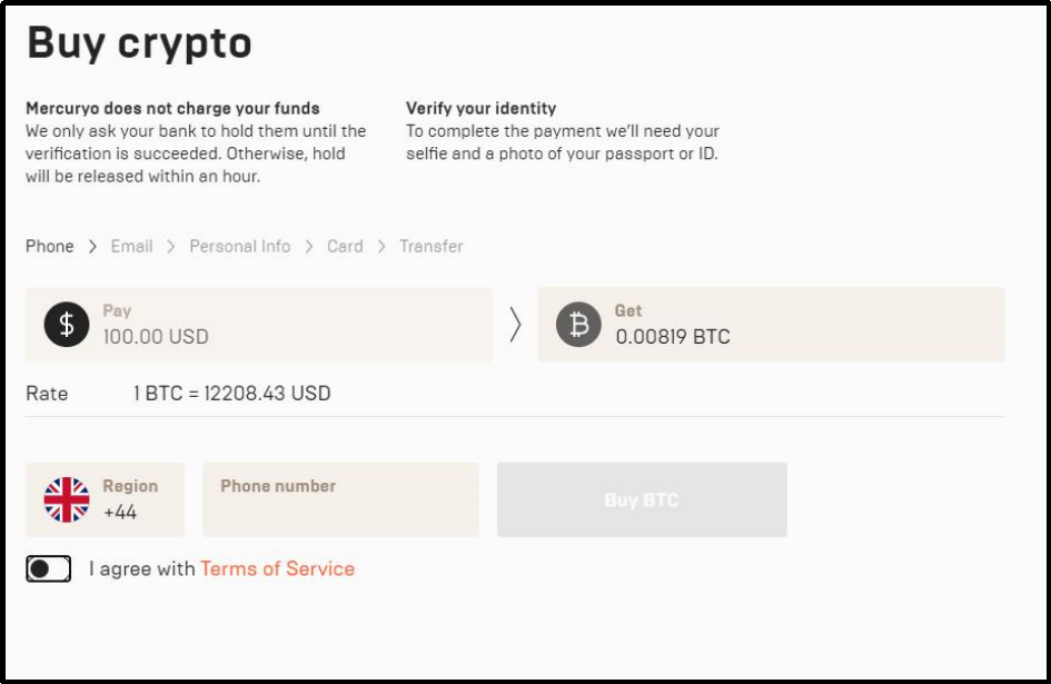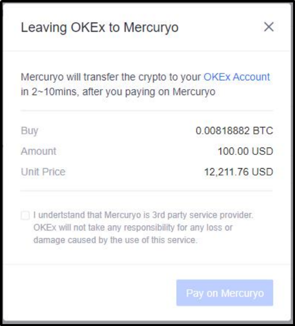 Once you click buy, a pop up summary will appear on the page for you to confirm by clicking the check box that you understand that Mercuryo is a 3rd party service provider.