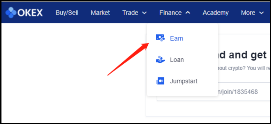 All you have to do is go to the Finance tab on the left top on OKEx web page and click on Earn from the drop-down list.