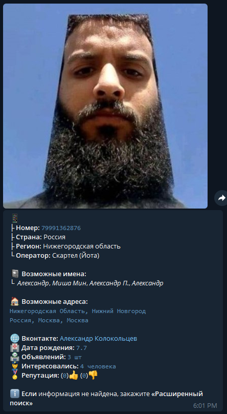 Затем нам достаточно перейти в "Глаз Бога", чтобы получить информацию о данном номере. Мы сразу получаем информацию о том, кому принадлежит данный номер. И им, как не странно оказывается Александр Колокольцев.