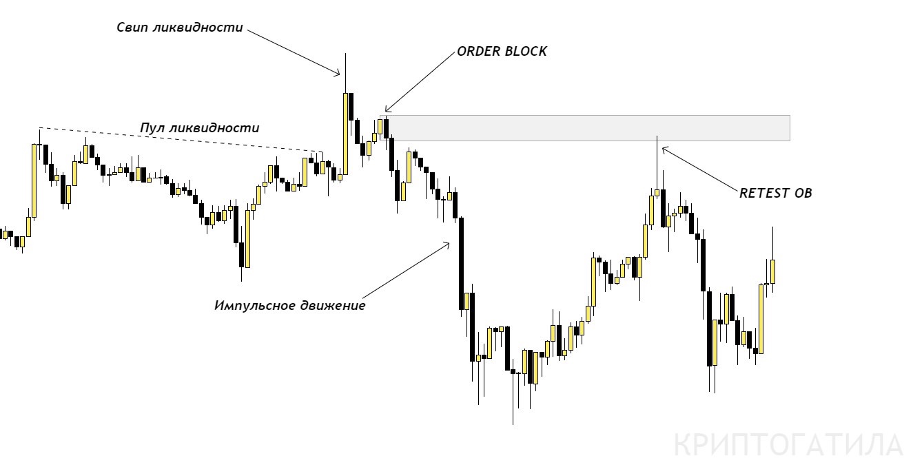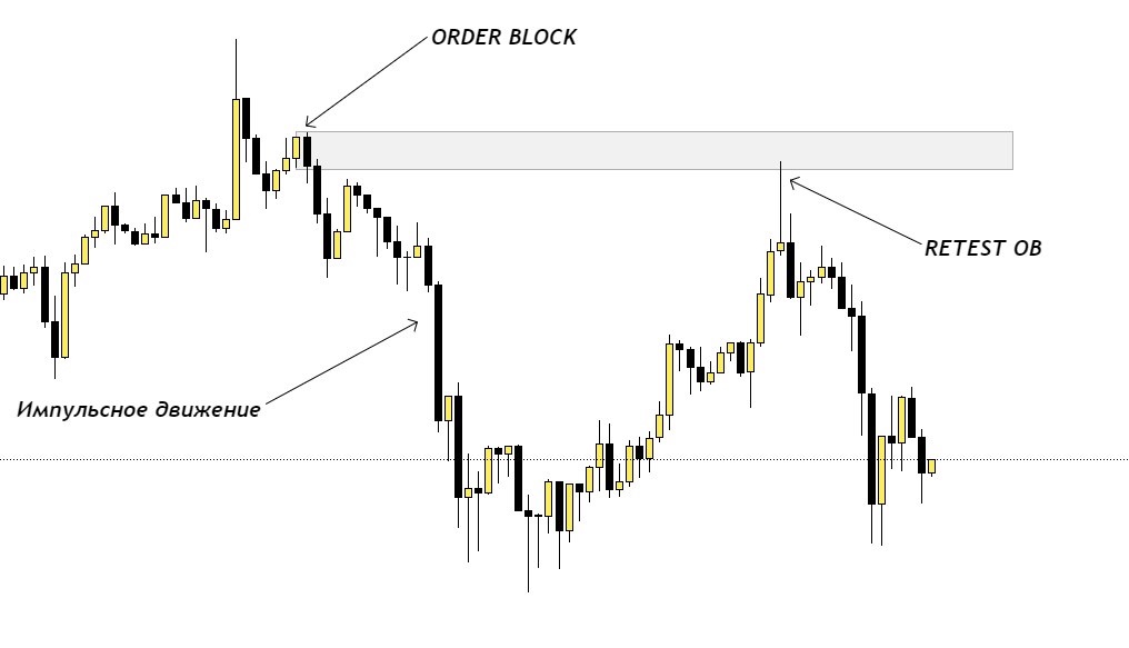 Ордер Блок (ОБ) - зона попиту і пропозиції, набір позицій великого гравця для подальшого маніпулювання ціною. Іншими словами це свічка в якій закладені кошти великого гравця для зміни тренду або його продовження. У цій свічці закладені ордери великого гравця який дав рух ціни в одну із сторін і буде зацікавлений в поверненні своїх коштів. Свічка ОБ знаходиться перед імпульсним рухом, прямо перед його основою.