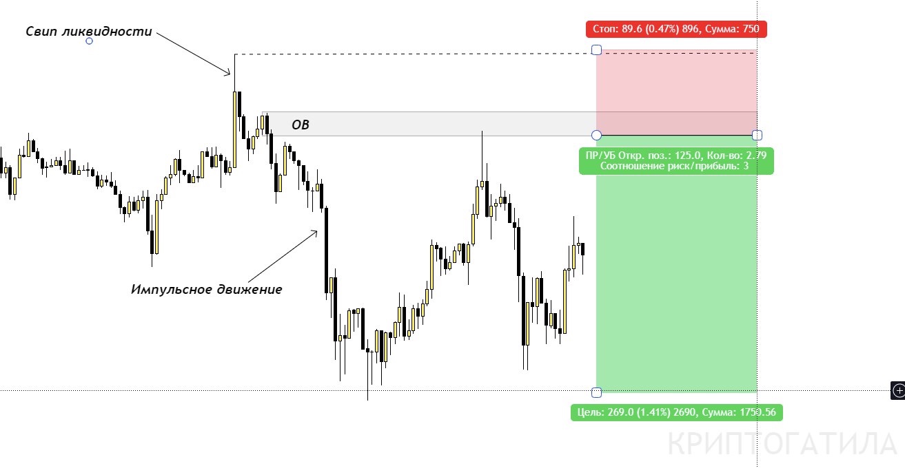 Так само ордер блок може виступати в окремих випадках перед свіпом ліквідності як показано на графіку нижче. У такому разі межі ОБ вважатимуться межею свічки свіпу ліквідності і стоп-лосс ви виносите за межу свіпу ліквідності.
