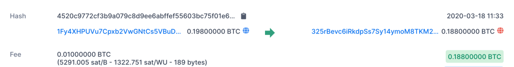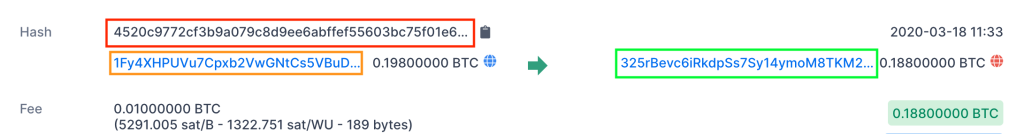 Биткоин адреса идентифицируются случайными строками из цифр и букв. Строка в оранжевом прямоугольнике является идентификатором биткоин-адреса. В оранжевом прямоугольнике выделен адрес отправки денег на второй адрес, который находится в зелёном прямоугольнике. Оранжевый адрес отправляет 0.1988 биткойна. Обратите внимание, что аббревиатура, используемая на фото "BTC" означает биткоин. Небольшая сумма биткоинов пойдёт на оплату комиссии (см чуть ниже оранжевого адреса), а оставшаяся сумма пойдёт на зелёный адрес. Цифра под записью зелёного адреса - это сумма, полученная после оплаты. И, наконец, справа вверху - дата и время транзакции. Для дальнейшего расследования нажмите на зеленый адрес, чтобы увидеть, что случилось с деньгами потом, или нажмите на оранжевый адрес, чтобы попытаться найти, откуда пришли деньги.
