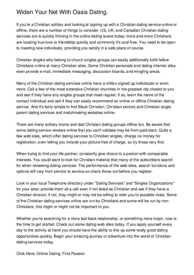 Oasis Online Dating Review . Oasis internet dating is rapidly growing just like all other online dating services, but 2 months in the past . Its goal is to hyperlink singles to singles, and get them connected via discussion or email . There are various things you need to know before signing up . The easiest method to start is to read through the . . .