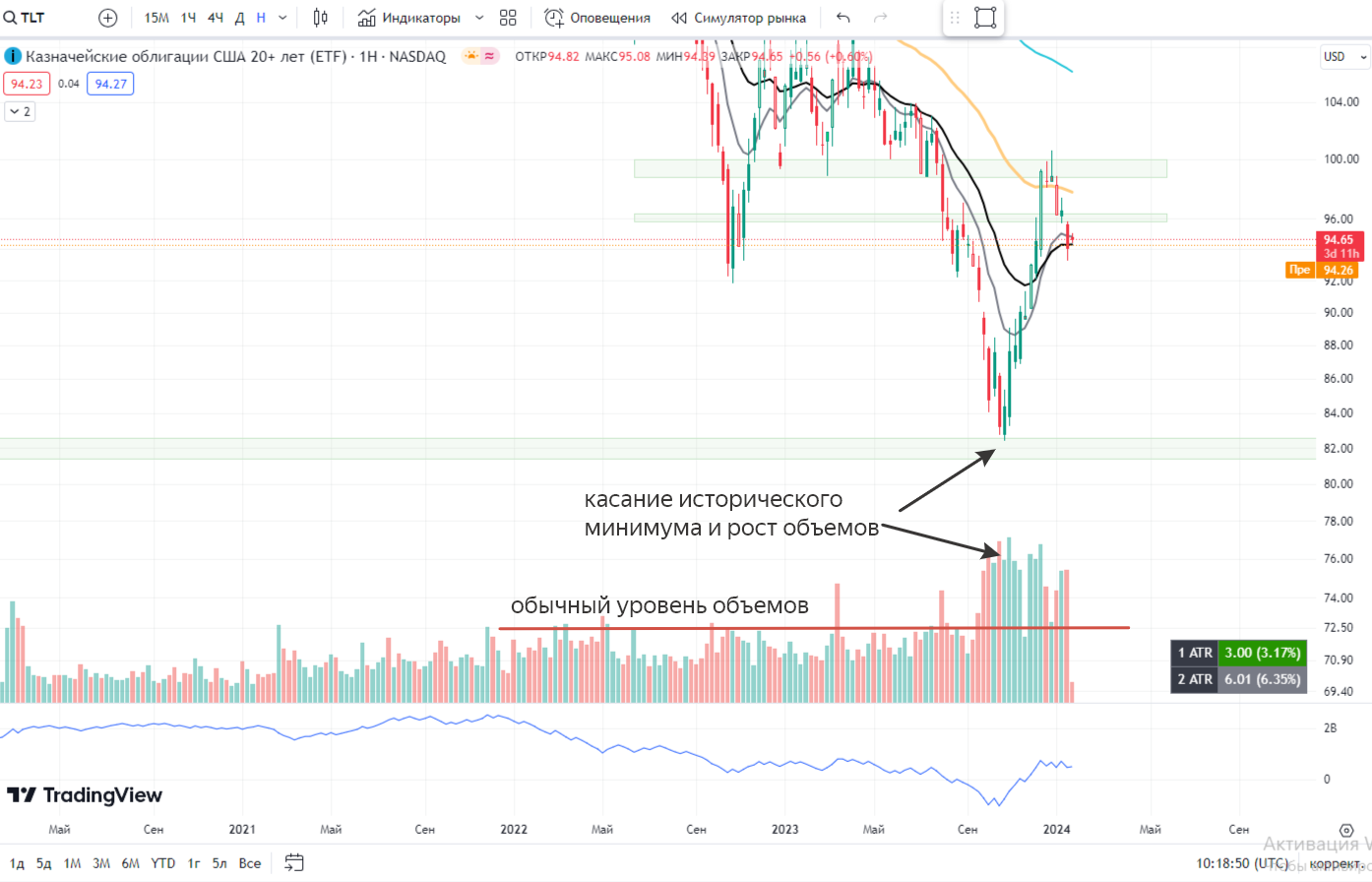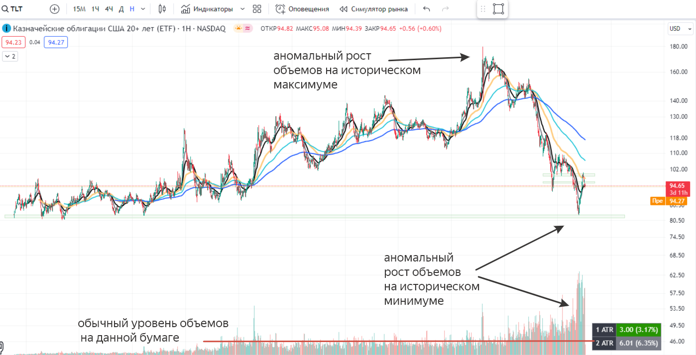Пример 1. Один из самых простых и любимых вариантов. TLT (о сделке с ней мы писали ранее), летит вниз и доходит до исторического минимума. И как следствие, мы видим аномальный рост объемов и отскок вверх!