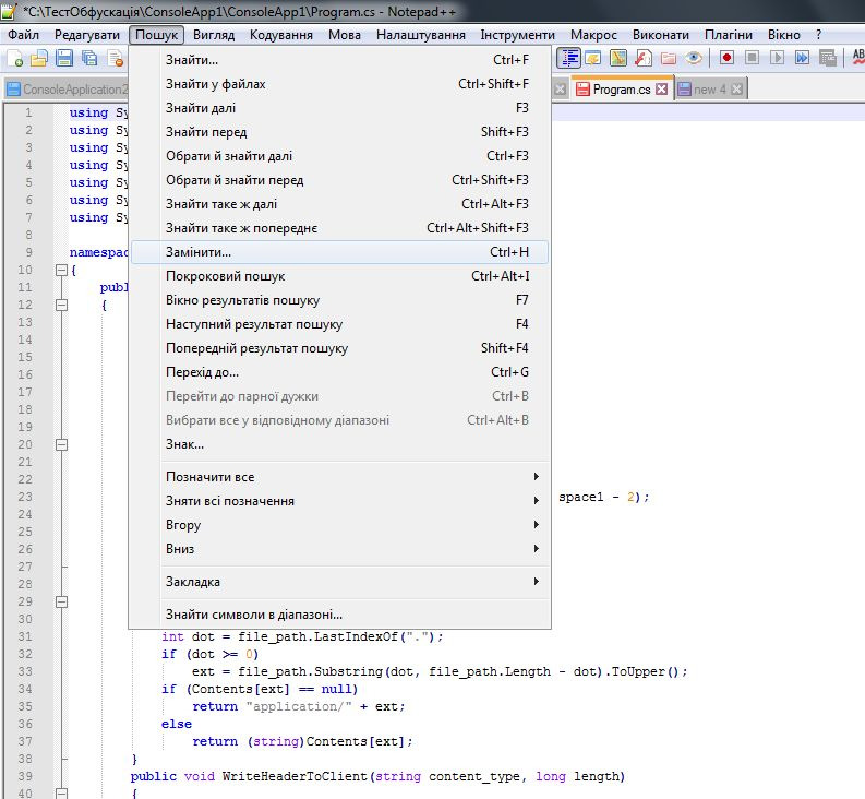 Як ми бачимо наш код легко декомпілювався , і ми отримали соурси програми , які можна легко розібрати. А тепер ми зробимо обфускацію імен змінних ,функцій ,классів (всі імена будуть схожі між собою) . Таку обфускацію кода можна зробити вручну через Notepad++.