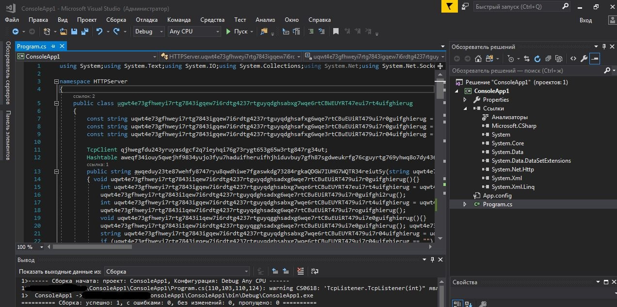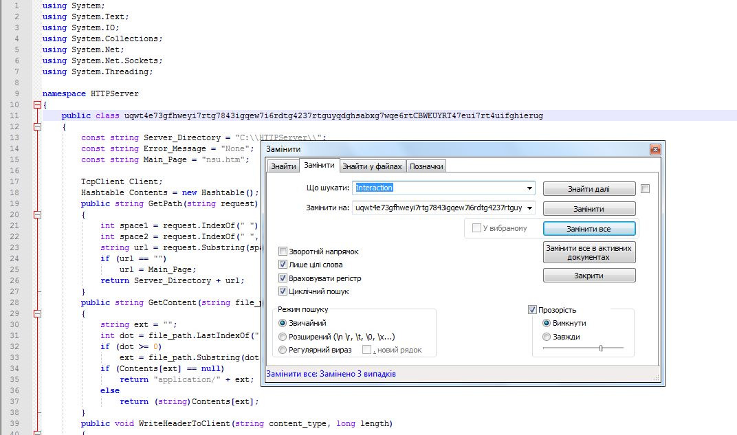 Міняємо всього 1 букву або цифру в нашому придуманому великому слові і так замінюємо кожну змінну , класс , функцію(що не входить в модулі using) .