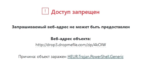 Первым в бой идет Kaspersky. Проверяем нашу полезную нагрузку msfvenom в первоначальном виде. KAV даже не дал перейти по ссылке для скачивания файла xaker.ps1!