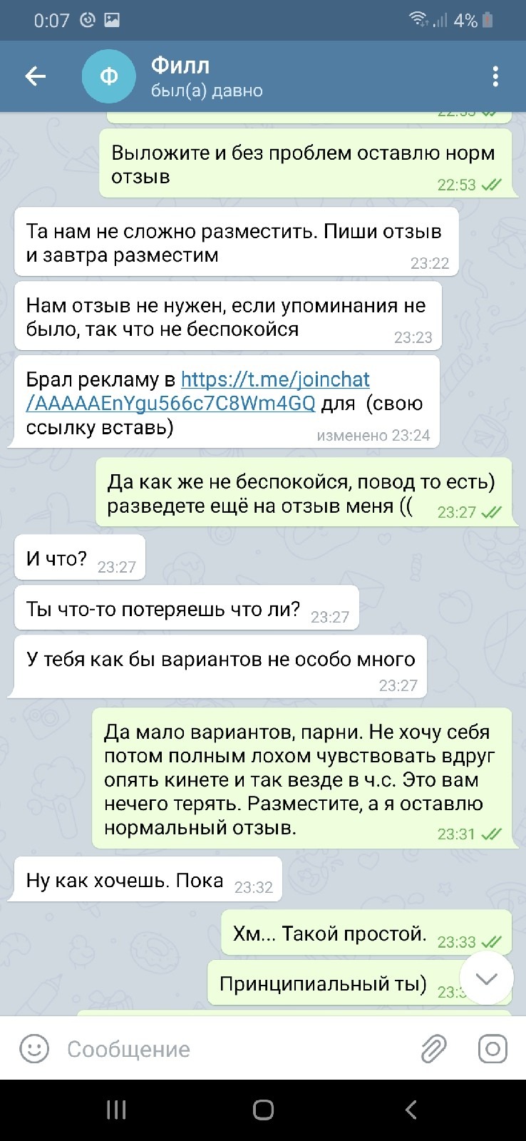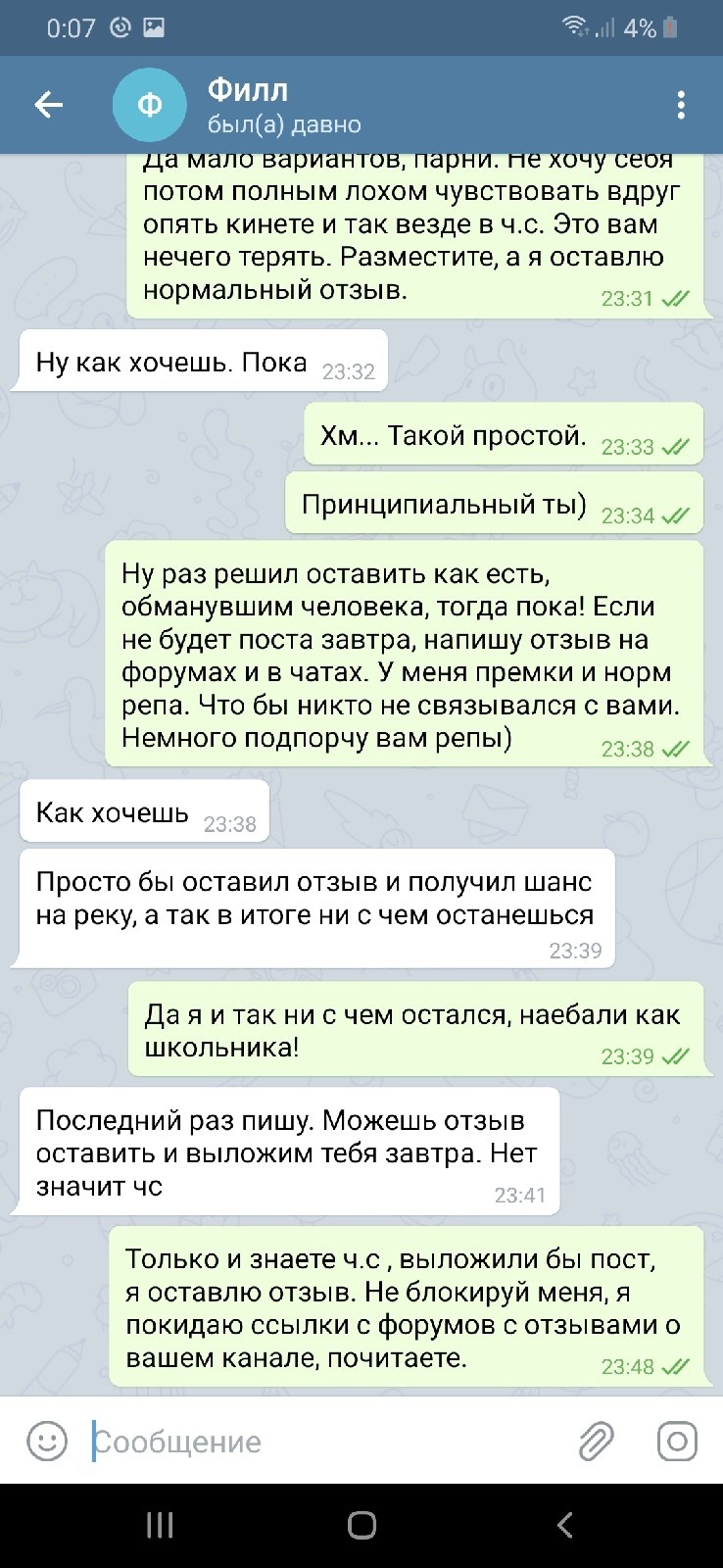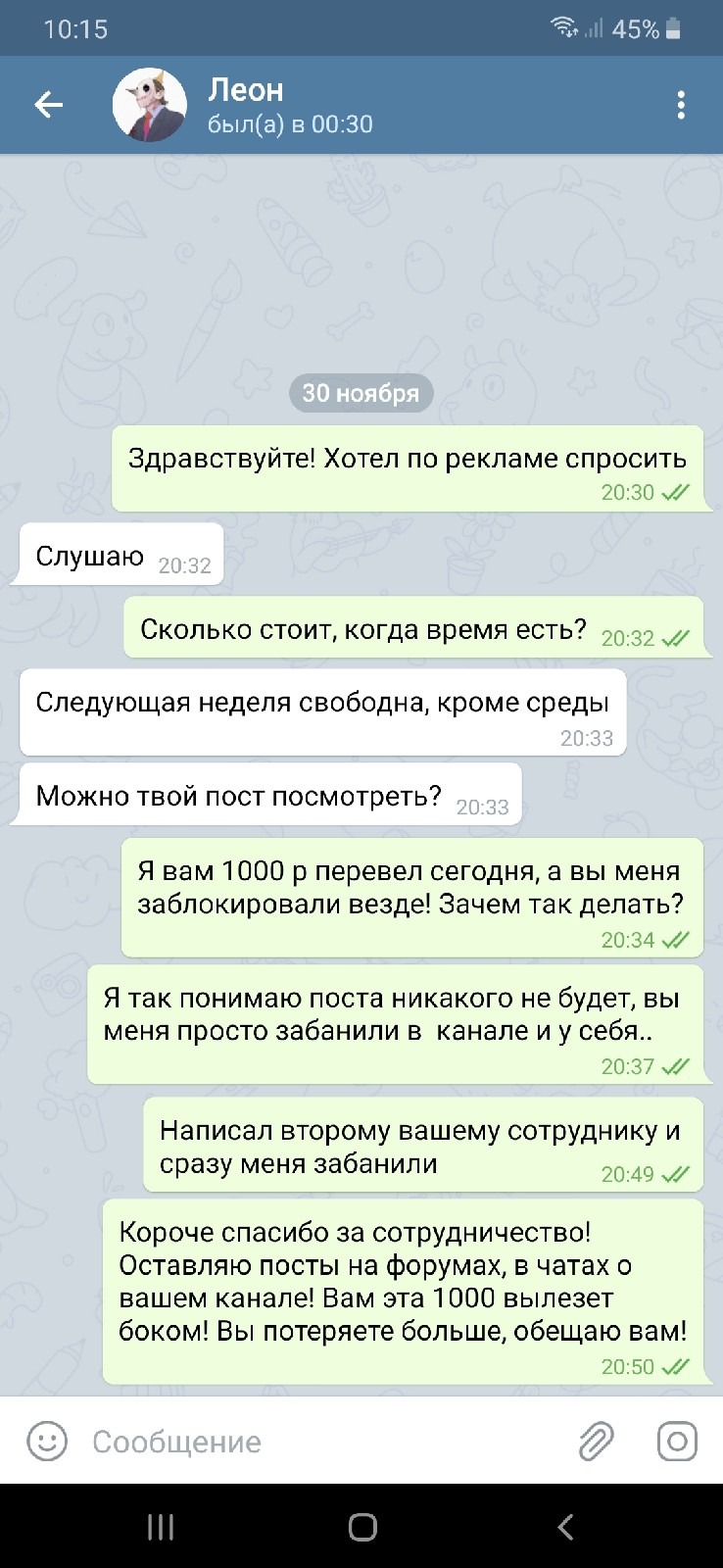 В общении вроде нормальные адекватные парни, (Сначала так думал) канал тоже норм, за такую сумму согласился, хоть и были сомнения, дешево. Перевел на киви и все, бан от канала и ч.с