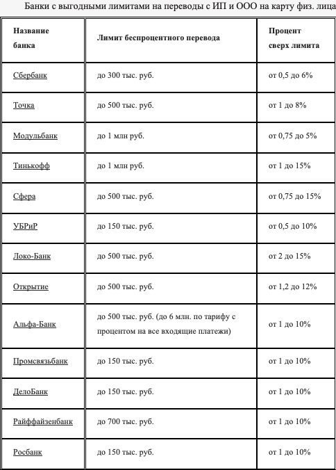 Многие банки устанавливают для клиентов лимиты на разовое снятие или в течение месяца. Например, суммы до 250 000 рублей можно снимать без каких-либо комиссий либо по минимальному тарифу. Если же данное ограничение по деньгам вам не подходит, и снять нужно крупную сумму, то придётся оплатить повышенную комиссию. В зависимости от политики банка её величина может достигать до 10%. - до 1 000 000 р. без комиссии в зависимости от тарифа, а далее от 1%, либо на одном из тарифов можно отдавать только 19 р. за платежное поручение и разом до 500 000 выводить;- от 1,4% до 3%; - от 1,5%.