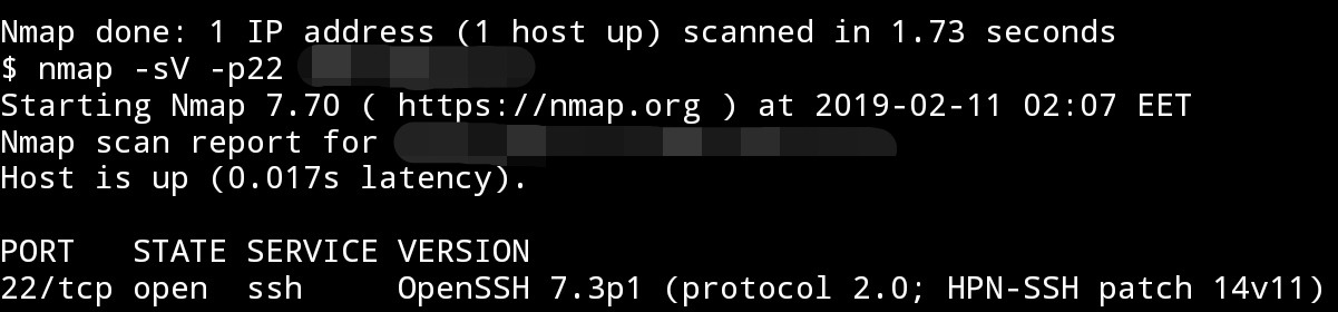Ниже приведен пример определения версии служб без использования сценариев NSE. Nmap обнаружил службу SSH на порту 22, где используемая версия «OpenSSH 7.3p1».