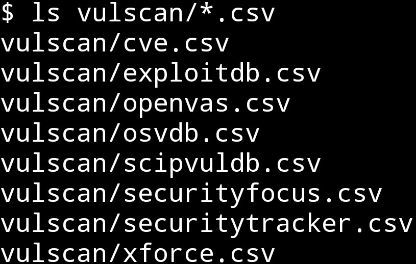 Как упоминалось ранее, vulscan использует предварительно сконфигурированные базы данных, которые хранятся локально на нашем устройстве. Мы можем просмотреть эти базы данных в корне каталога vulscan. Запустите приведенную ниже команду ls для просмотра списка доступных баз данных.