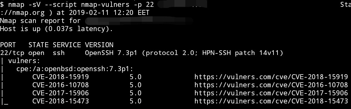 Могут быть уязвимости где это число значительно ниже или наоборот, выше. Чем выше степень серьёзности, тем следовательно, больше внимания стоит уделить к CVE. Скрипт vulscan (отображается после всех CVE) также сообщил о более десятке интересных уязвимостей, связанных с OpenSSH 7.3p1.