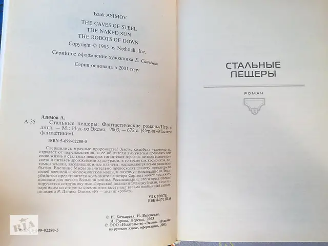 Стальные пещеры . Обнаженное солнце . Роботы зари . авторский сборник, 2003 год . Описание: Три романа из цикла «Детектив Элайдж Бейли и робот Дэниел Оливо» . Иллюстрация на обложке С .