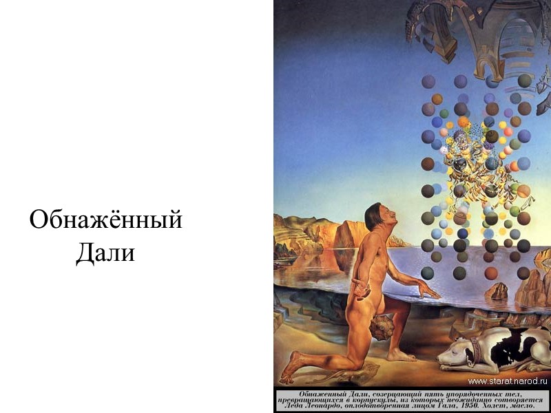 художник: Сальвадор Дали (1904-1989) Обнажённый Дали, созерцающий пять упорядоченных тел, превращающихся в карпускулы, из которых неожиданно сотворяются Леда Леонардо, оплодотворённая лицом Гала . (Холст, масло, 1950г .) …Сюжета вновь манят метаморфозы .