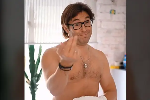 Обнаженный по пояс Малахов в замедленной съёмке трет свою грудь и плечи, по его лицу стекают струйки воды…
