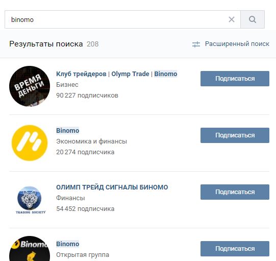 Идём искать в паблики а-ля "Бинарные опционы" "Binomo"