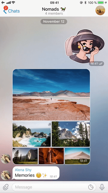 Начиная с Telegram 4.5, каждый раз, когда вы отправляете несколько фотографий или видео, они группируются в альбомы. Каждый альбом может содержать до 10 фотографий или видео, расположенных в чате в виде элегантных пропорциональных эскизов. Они также ведут к одному уведомлению вместо десяти на стороне получателя.