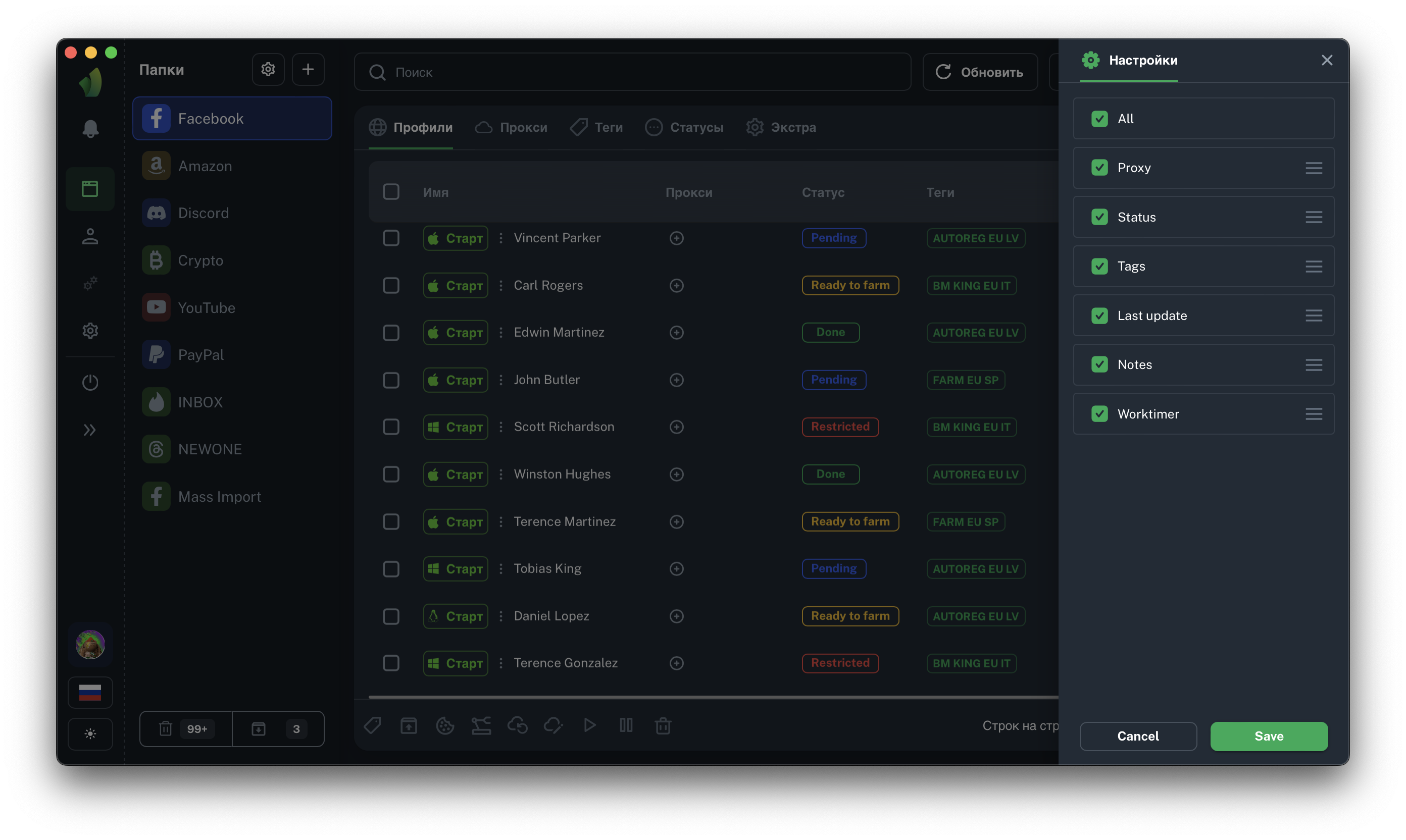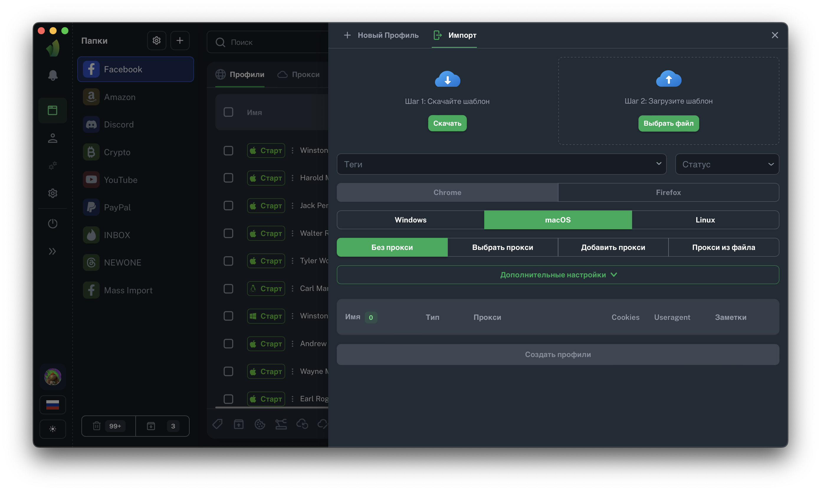 Важно: имея заполненный .csv файл можно просто "перетащить" его в таблицу профилей, не открывая сайдбар создания профиля.