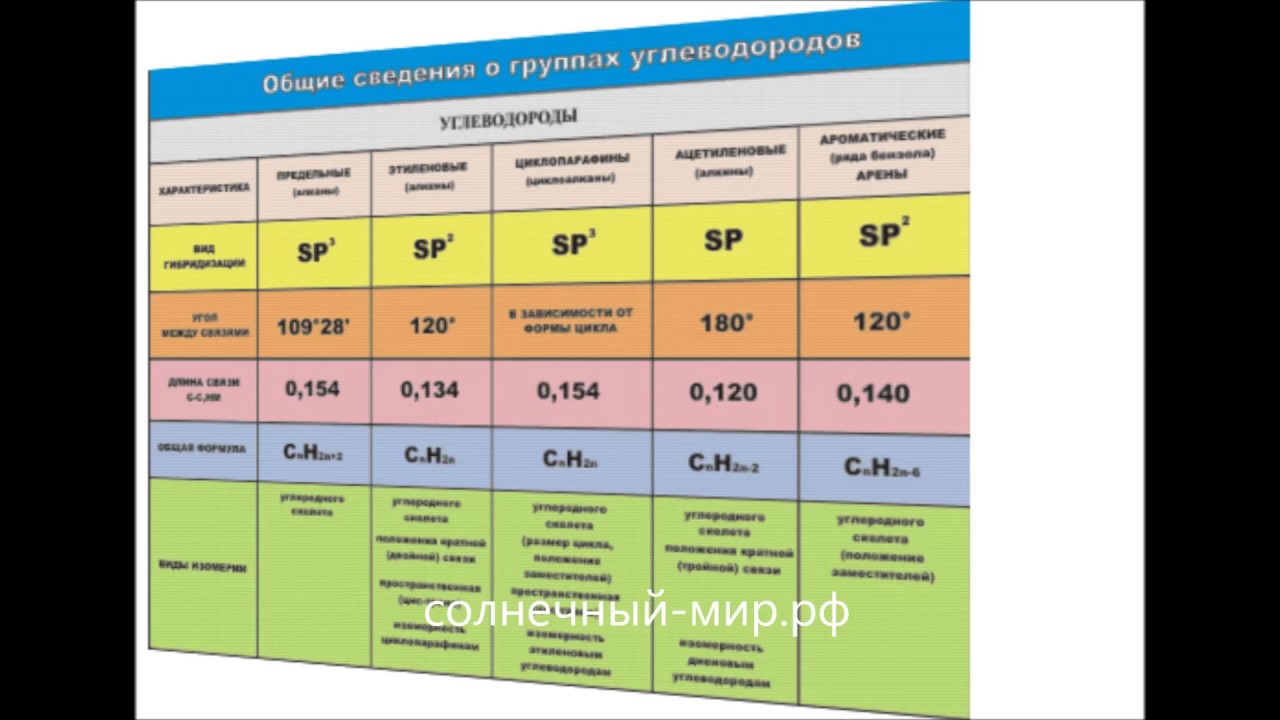 Обобщающий таблица углеводороды