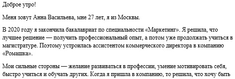 Образец краткой самопрезентации