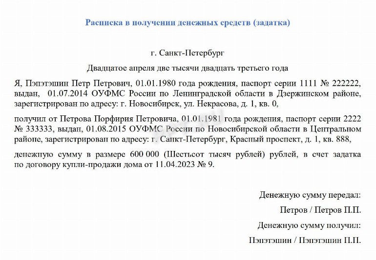 Образец расписки предоплаты