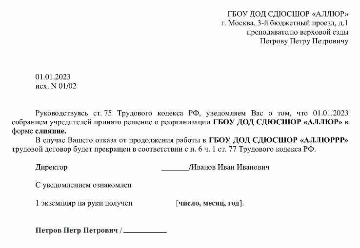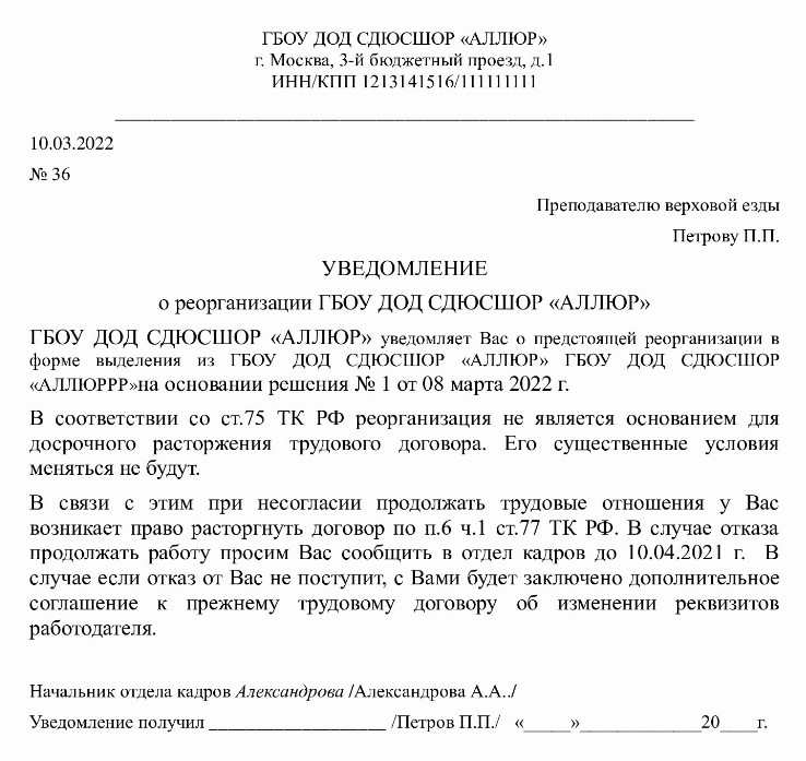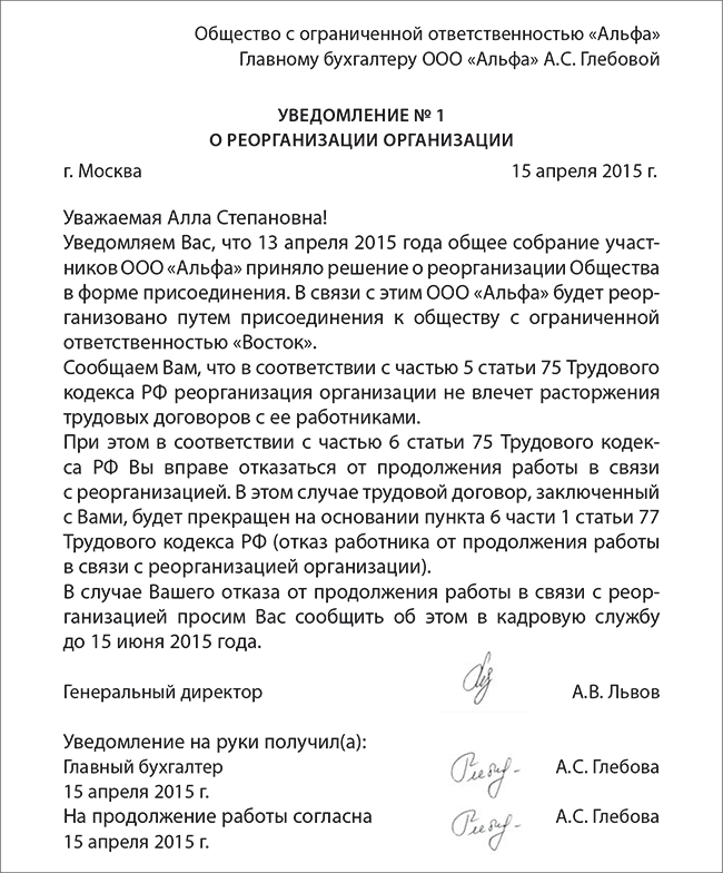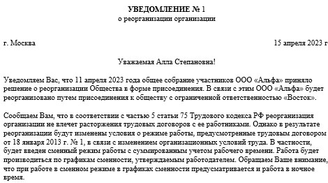 Образец уведомления работникам о реорганизации