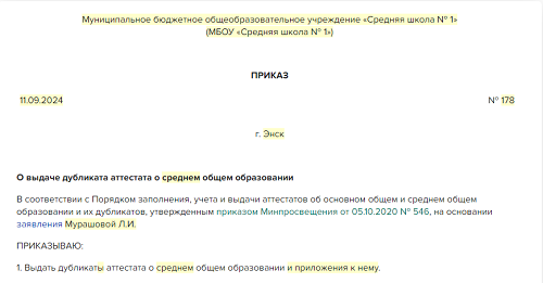 Образец выдачи дубликата аттестата