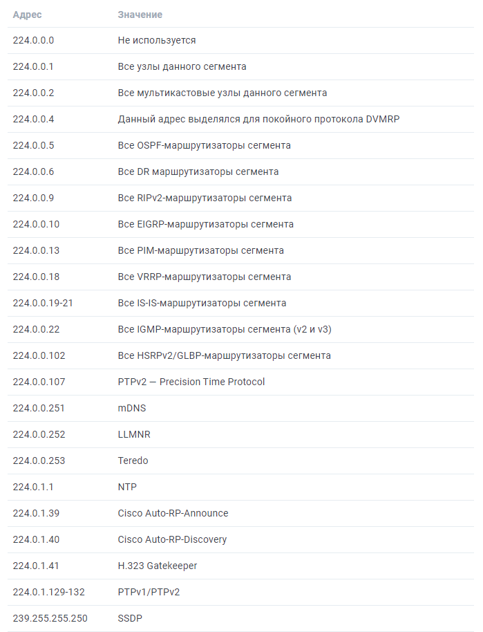 Вот почему в IPv4 был заложен блок адресов класса D: 224.0.0.0/4 (224.0.0.0-239.255.255.255). Адреса этого диапазона определяют мультикастовую группу. Один адрес — это одна группа, обычно она обозначается буквой «G». То есть, говоря, что клиент подключен к группе 224.2.2.4, мы имеем ввиду, что он получает мультикастовый трафик с адресом назначения 224.2.2.4.