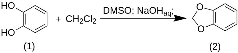 Трехгорлые круглодонные колбы емкостью 1 л с обратным холодильником, магнитной/верхней мешалкой и термометром заполняли катехином (1) (20,0 г, 182 ммоль) и водным раствором гидроксида натрия (30 мл, 19,4 М, 582 ммоль), которые растворяют в 200 мл диметилсульфоксида. Полученный зеленый раствор нагревали до 90–100°С. К раствору по каплям добавляли дихлорметан (40 мл, 626 мл) и кипятили с обратным холодильником при 90–100°С в течение 4 ч. Смеси давали остыть и добавляли 200 мл воды. Смесь декантировали и продукт экстрагировали диэтиловым эфиром (3 х 200 мл). Экстракты диэтилового эфира промывали 3 раза по 200 мл воды, сушили над безводным сульфатом натрия и декантировали. Растворитель удаляли с помощью роторного испарителя, получая светло-коричневое масло.