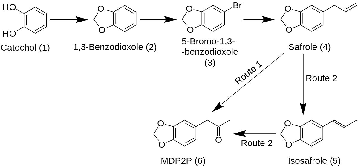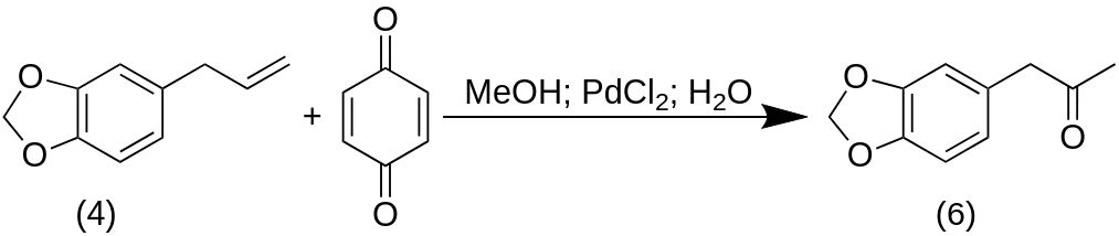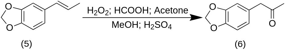 В этой статье представлен синтетический метод получения MDP2P (6) из катехина через сафрол, пути реакции показаны на схеме ниже. Синтез Сафрола представляет собой реакцию с двумя разными условиями и несколько разными выходами.
