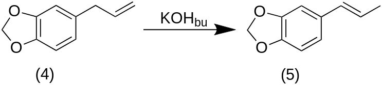Сафрол (1,40 г, 8,63 ммоль) растворяли в 3 М растворе гидроксида калия в 1-бутаноле (10 мл, 30 ммоль). Полученный раствор нагревали с обратным холодильником в течение 3 часов и давали остыть. К раствору добавляли 10 мл 1,6 М раствора хлористоводородной кислоты. Продукт экстрагировали 3 х 40 мл диэтилового эфира и промывали 3 х 40 мл воды. Органические экстракты сушили над безводным сульфатом натрия, декантировали и растворитель удаляли с помощью роторного испарителя, получая коричневое масло.