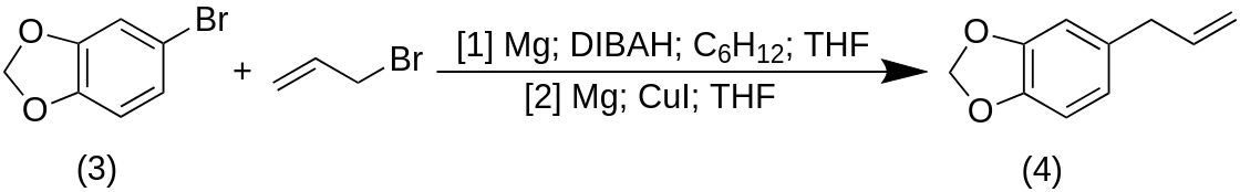 Следующую реакцию Гриньяра проводили с использованием сухой грушевидной колбы емкостью 10 мл в атмосфере азота. Магний (0,60 г, 25 ммоль), 5-бром-1,3-бензодиоксол (3) (0,40 мл, 3,3 ммоль) и 1,5 М раствор ДИБАГ в циклогексане (0,10 мл, 150 ммоль) перемешивали в 20 мл безводный ТГФ. По каплям добавляли дополнительно 5-бром-1,3-бензодиоксол (3) (2,60 мл, 21,5 ммоль) и смесь перемешивали в течение 2 часов. Раствор удаляли шприцем и по каплям добавляли к аллилбромиду (4,0 мл, 46 ммоль), содержащемуся на ледяной бане. Раствор перемешивали в течение 24 часов и реакцию гасили добавлением 20 мл воды и 20 мл насыщенного хлорида аммония. Продукт экстрагировали 3 х 80 мл диэтилового эфира и промывали 3 х 100 мл воды. Эфирные экстракты сушили над безводным сульфатом натрия, декантировали и растворитель удаляли на роторном испарителе, получая коричневое масло.