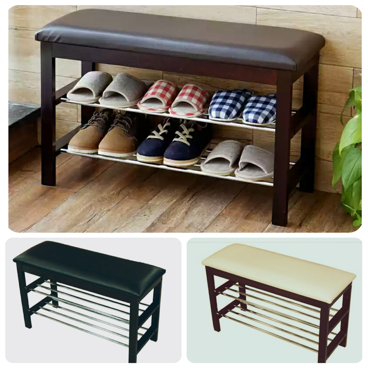 Полки для обуви (обувница) из дерева, металла и пластика на фото . Обувница с сиденьем для прихожей на фото . Полки для обуви в узкой прихожей на фото .
