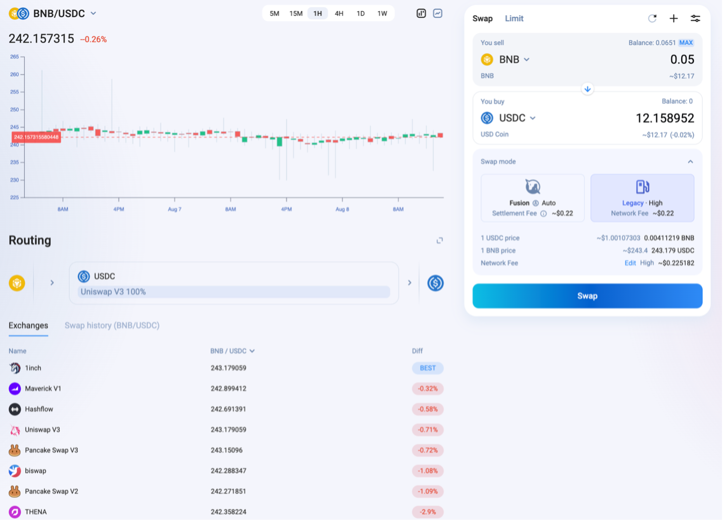 Режим «Legacy» — это классическая версия, где вы получаете наиболее выгодный курс, но при этом должны будете заплатить комиссию за работу сети. По сути, это самый стандартный обмен, к которому вы привыкли.