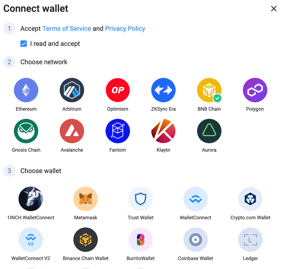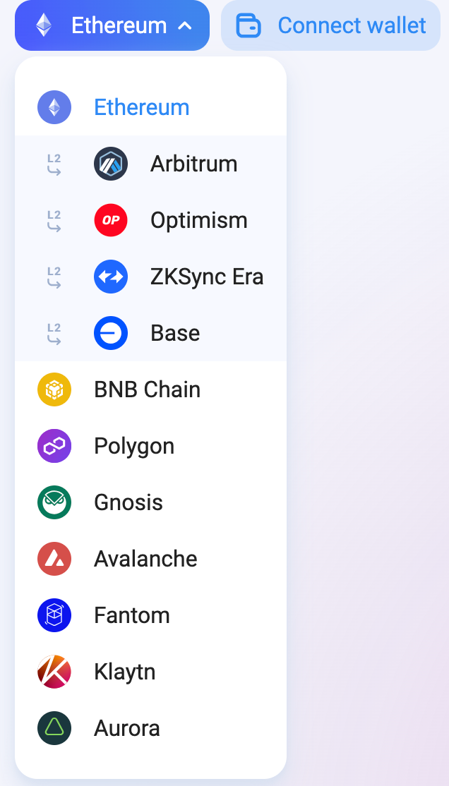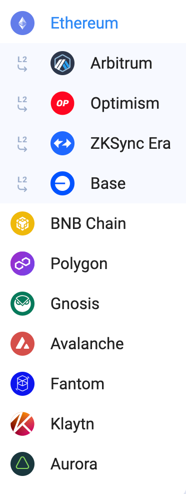 Проект поддерживает следующие сети: Ethereum, Arbitrum, Optimism, zkSync, Base, BNB Chain, Polygon, Gnosis, Avalanche, Fantom, Klaytn, Aurora.