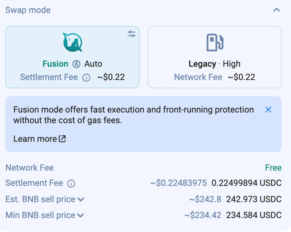А вот режим «Fusion» позволяет вам не платить комиссию за сеть. Вместо этого, плата вычитается из суммы, которую вы обмениваете. Однако, курс обмена будет не такой выгодный, как в «Legacy» режиме.