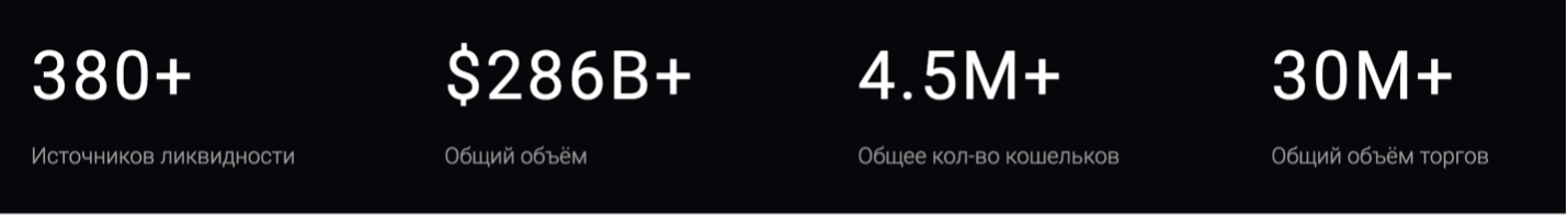 Всего 1inch использует более 380 децентрализованных бирж. За все время при помощи агрегатора было произведено 30 миллионов обменов на 286 миллиардов долларов. И все действия совершались более чем на 4,5 миллионах кошельков.