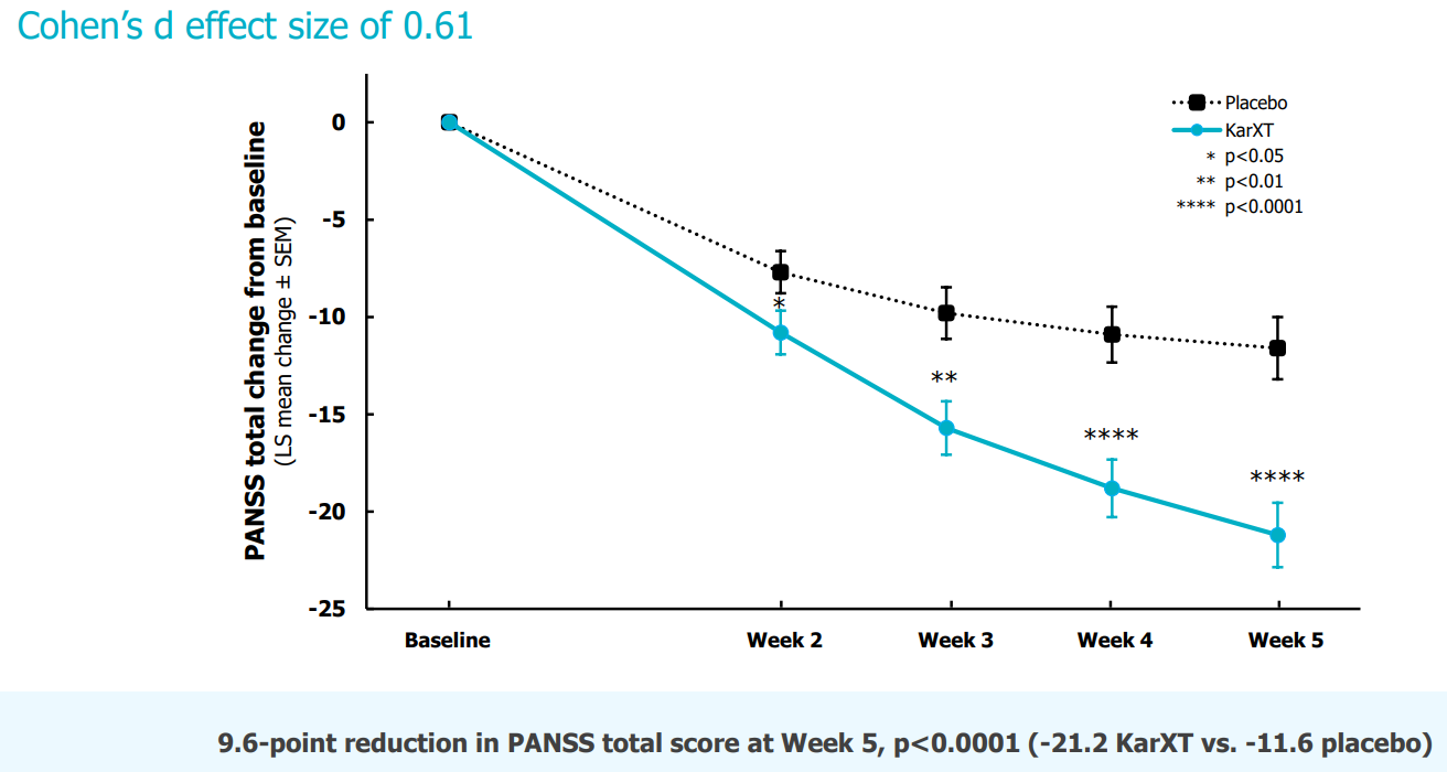 - Эффект наступал со второй недели лечения. На 5 неделе лечения снижение общего балла PANSS (облегчение как позитивных, так и негативных симптомов шизофрении) составило 9.6 (-21.2 KarXT против -11.6 в группе плацебо, p<0.0001)