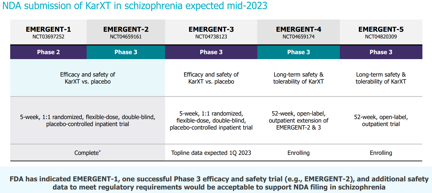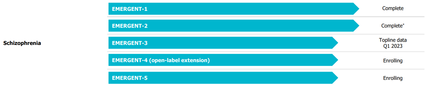 ➡️ Открытое КИ 3 фазы EMERGENT-4 (350 пациентов с шизофренией, 40 центров США и Украины, 52 недели лечения) - продолжение EMERGENT-2 и 3. Начато в феврале 2021.