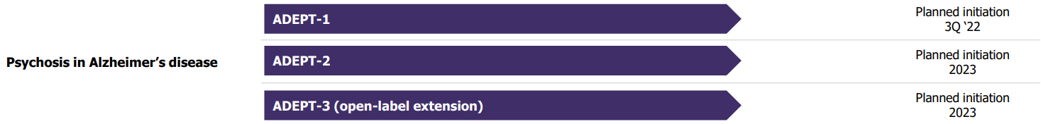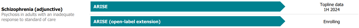 ➡️ КИ 3 фазы ARISE (400 пациентов с шизофренией, которую не удается контролировать стандартным лечением, 7 центров США, 6 недель лечения). Начато в ноябре 2021.