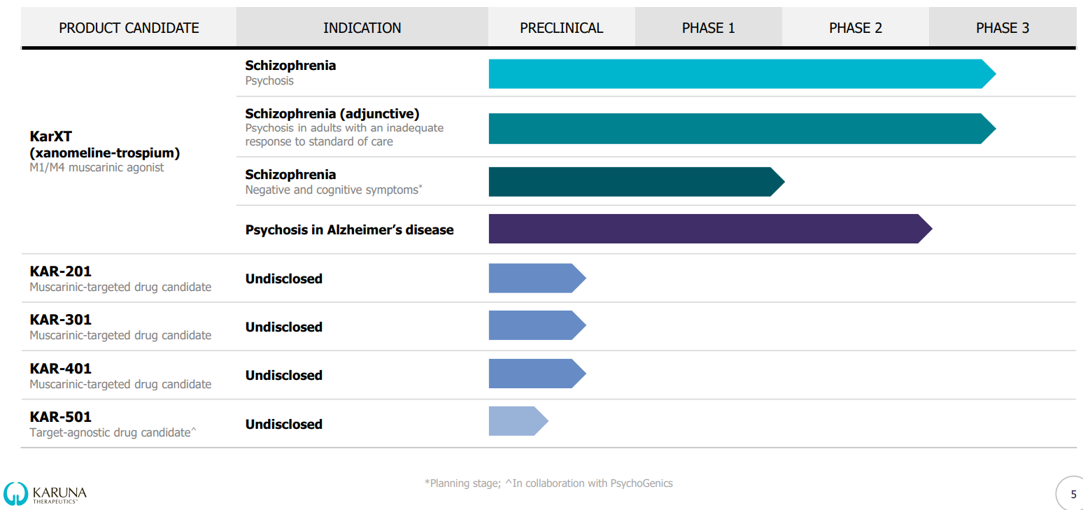 В пайплайне компании 1 препарат-кандидат на клинической стадии исследований - KarXT. Исследуется по двум показаниям - шизофрения и психоз при болезни Альцгеймера.