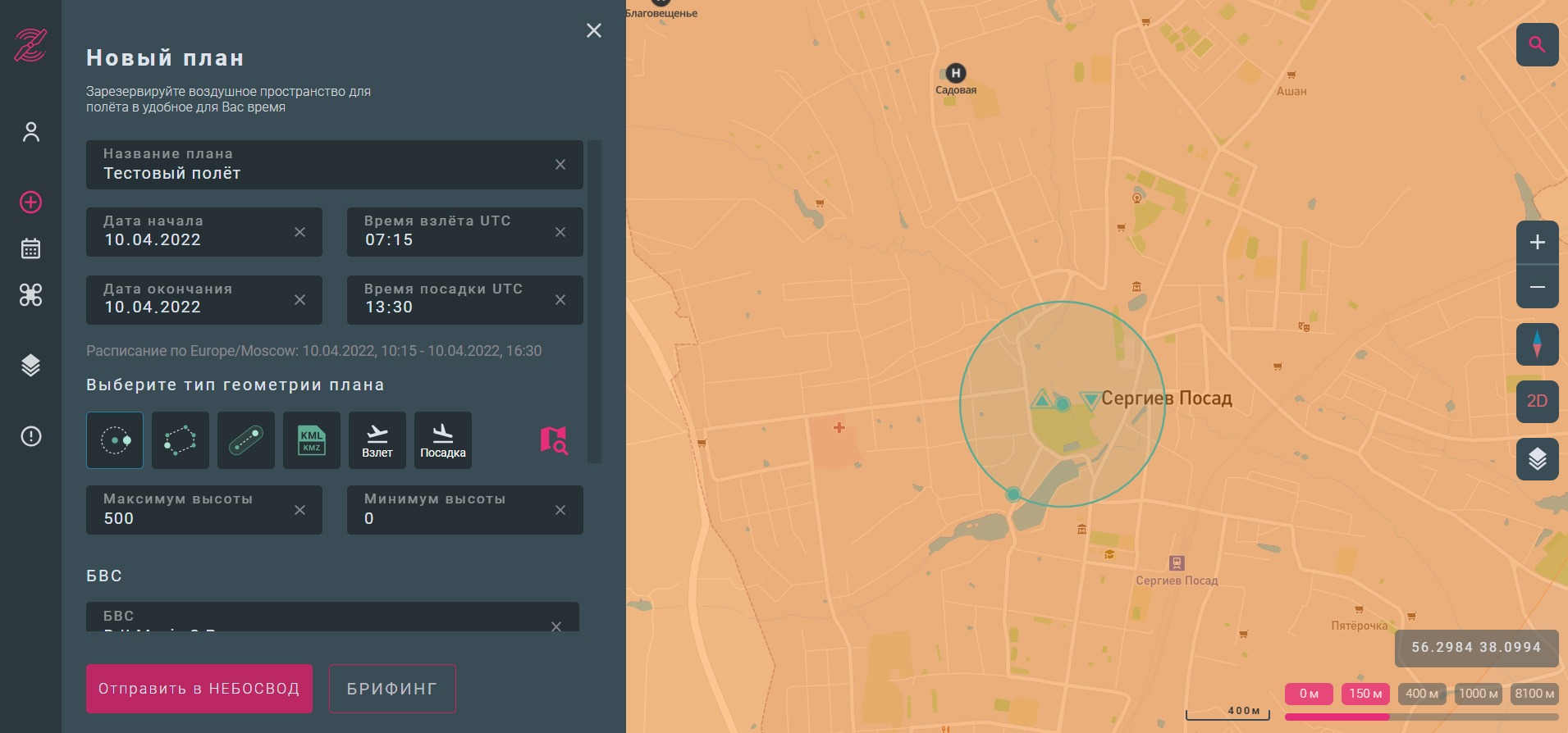 Необходимо указать название плана, дату и время (в формате UTC, чуть ниже отображается и в привычном формате), границы или маршрут полёта с возможностью указания конфигурации на карте и импорта из файла с координатами, точку взлёта и посадки, минимум и максимум высоты, выбрать БВС, указать цель полёта и критерий "в пределах прямой видимости".