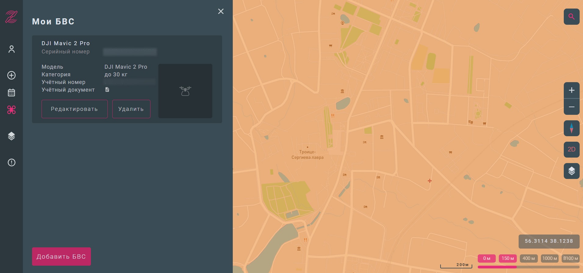 При тестировании были добавлены сведения об одном БВС, но можно добавлять иные БВС, находящиеся в вашем распоряжении
