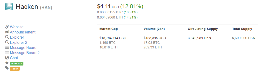 ICO началось 31-го октября 2017-го года и планировалось продать 1.3 млн токенов на пресейле и 18.7 млн во время публичной продажи (всего 20 млн). Однако, хардкапа достичь не удалось. Было продано около 7-ми млн токенов HKN, если верить информации с icobench (на coinmarketcap дана информация о 5.6 млн токенов). На момент проведения ICO цена одного токена HKN равнялась $1.