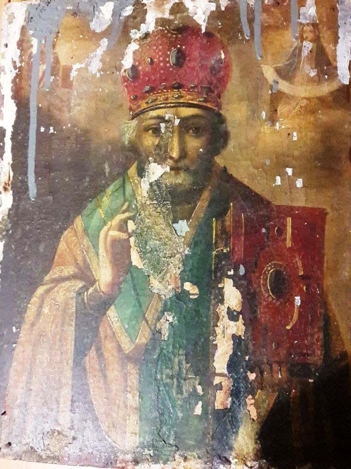 История Очакова. В гостях у Деда - Краеведа.Все произошло очень неожиданно. После службы к нам обратилась работница храма Ольга Ивановна и попросила помочь с иконой Николая Чудотворца, которую принес отцу Виктору неизвестный, нашедший ее около мусорного бака. На нас посмотрел наш любимый святой, покровитель г.Очакова, да и всех приморских городов, и сразу стало ясно, что нужно спасать икону. Следы варварского обращения с ней были налицо: забито огромное количество гвоздей сверху и снизу иконы, посредине зияют дыры от более крупных гвоздей, кроме того, икона повреждена шашелем. В верхнем левом углу - Благословляющий Спаситель с Евангелием в руках, полностью залит масляной серой краской. Но главное повреждение в центральной части иконы – обезображен лик самого святого. В правом верхнем углу – Покров Божией Матери, который изображен лишь силуэтом, легко, воздушно, невесомо, чтобы не утяжелять саму икону. Эта единая композиция – символ единения Николая Чудотворца с Господом и Богоматерью.