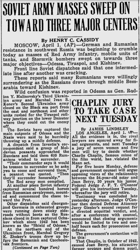 МОСКВА, 1 апреля (AP) - сегодня немецкое и румынское сопротивление на юго-западе России было сломлено в результате активного наступления мотопехотных и танковых войск Красной Армии при огневой поддержке штурмовых бомбардировщиков в направлении трех основных целей - Одессы, Тирасполя и Кишинева.