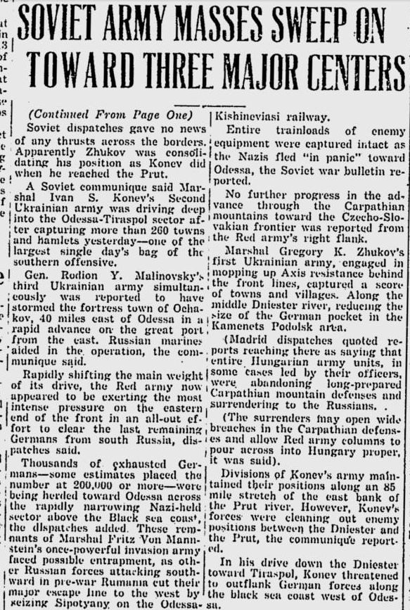 В официальных сводках Советского Союза говорилось, что вчера войска Второй Украинской армии под руководством маршала Ивана С. Конева продвинулись глубоко в сектор Одесса-Тирасполь после захвата более 260 городов и деревень, это был один из дней крупнейших потерь противника, понесенных в ходе наступательной операции на Южной линии фронта.