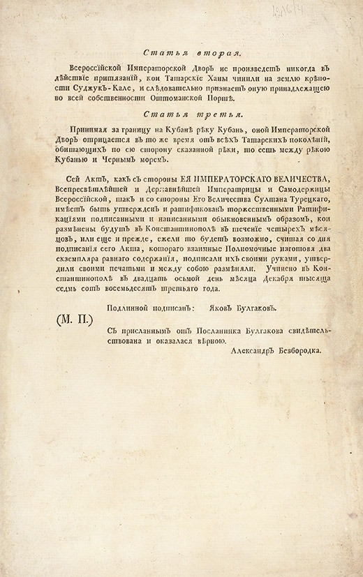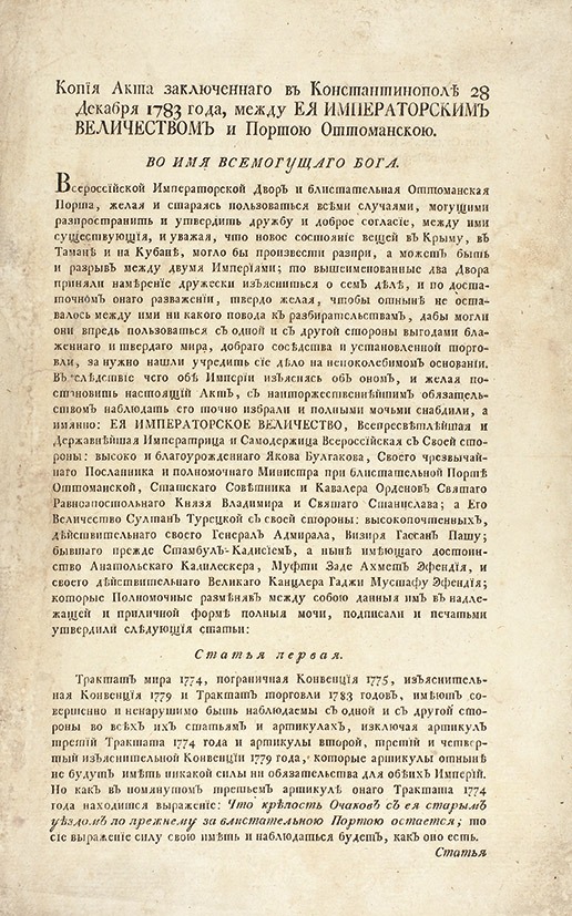 Всероссийский императорский двор и Блистательная Оттоманская Порта, желая и стараясь пользоваться всеми случаями, могущими распространить и утвердить дружбу и доброе согласие, между ими существующие, и уважая, что новое состояние вещей в Крыму, в Тамани и на Кубани могло бы произвести распри, а может быть, и разрыв между двумя империями, то вышеименованные два двора приняли намерение дружески изъясниться о сем деле, и по достаточном оного разважении, твердо желая, чтобы отныне не оставалось между ими никакого повода к разбирательствам, дабы могли они впредь пользоваться с одной и с другой стороны выгодами блаженного и твердого мира, доброго соседства и установленной торговли, за нужно нашли учредить сие дело на непоколебимом основании – вследствие чего обе империи, изъяснясь об оном и желая постановить настоящий Акт, с наиторжественнейшим обязательством наблюдать его точно, избрали и полными мочьми снабдили, а именно: Ее императорское величество, всепресветлейшая и державнейшая императрица и самодержица Всероссийская с[о] своей стороны – высоко и благоурожденного Якова Булгакова, своего чрезвычайного посланника и полномочного министра при блистательной Порте Оттоманской, статского советника и кавалера орденов Святого равноапостольного князя Владимира и Святого Станислава; а Его величество султан турецкий с[о] своей стороны – высокопочтенных, действительного своего генерал-адмирала, визиря Гассан-пашу, бывшего прежде Стамбул-кадием(1) , а ныне имеющего достоинство анатольского кадизескера(2), Муфти Заде Ахмет-эфенди, и своего действительного великого канцлера Гаджи Мустафу-эфенди, которые, полномочные разменяв между собой данные им в надлежащей и приличной форме полные мочи, подписали и печатями утвердили следующие статьи: